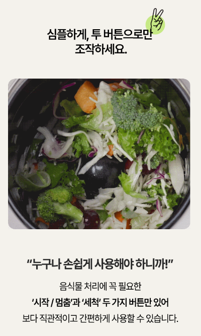 복잡한 설치나 설정 없이 플러그만 꽂고 컨테이너에 음식물 넣기만 하면 끝이기 때문에, 기계에 익숙하지 않은 사용자도 쉽게 적응할 수 있습니다.