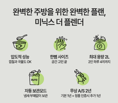 ‘미닉스 더플렌더’는 작지만 강한 기능을 탑재한 음식물 처리기입니다. 특히 1~2인 가구 또는 미니멀한 주방을 구성하고 싶은 분들에게 딱 맞는 제품이에요.
